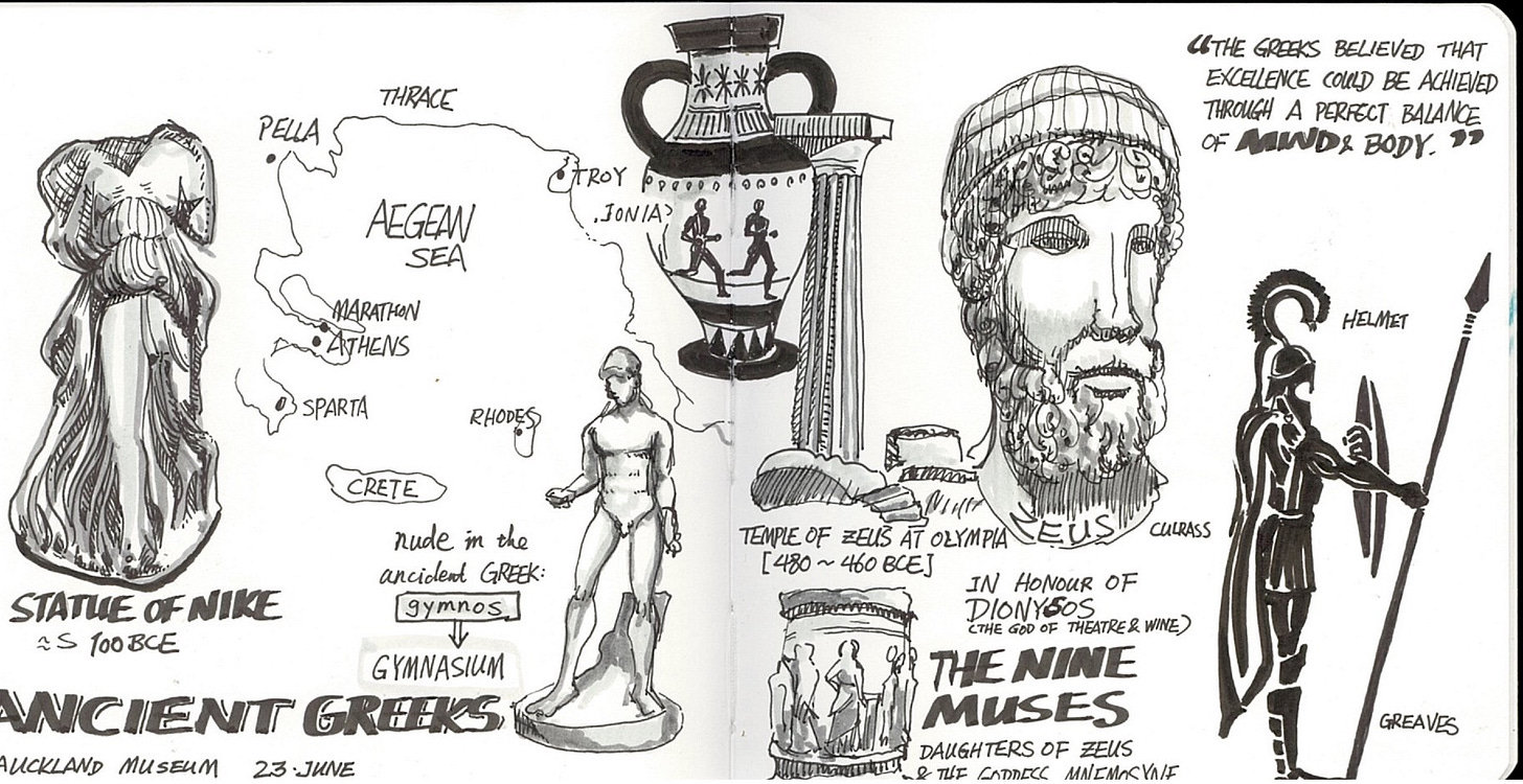 This is a sketchnote I made last year when my family visited an exhibition about ancient Greeks. I quite like it and don’t think any MidJourney prompt can do the same thing and also refresh my memory of those good times with my family.